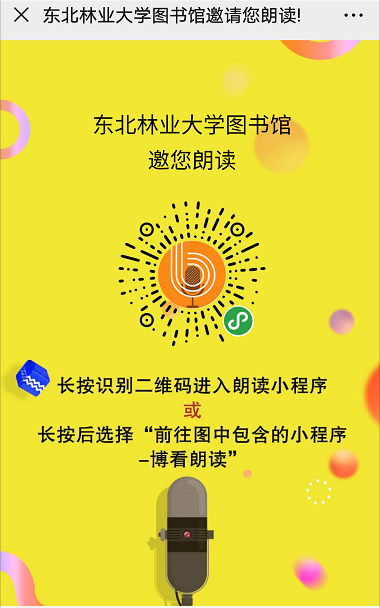 2、点击一级菜单“读者服务”-“朗读小程序”,长按识别二维码进入;