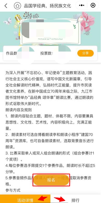 4、点击首页活动轮播图(小伙伴们注意啦,此次有三个朗读活动参与入口,大家一定要仔细阅读,点击“同心抗疫 为爱发声”报名入口),进入活动页面,可查看活动详情及排行榜,点击“报名”,提示去录制新的作品(录制前需要对麦克风进行授权),若已录制过参赛作品,则勾选参赛作品进入下一步;