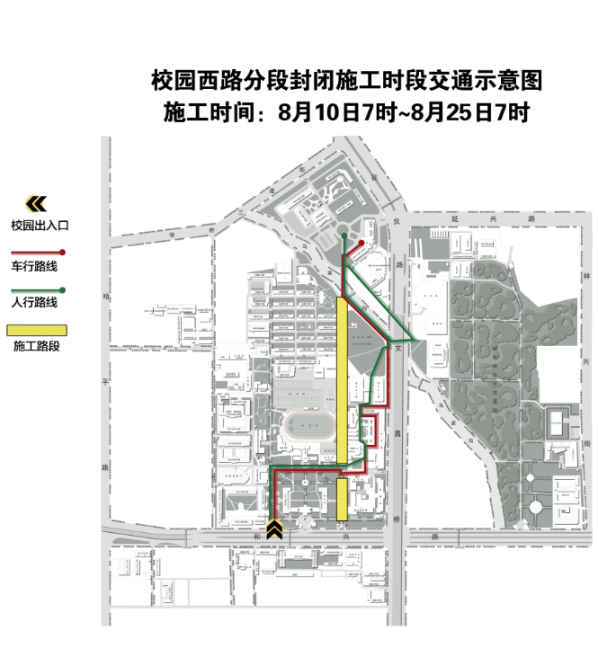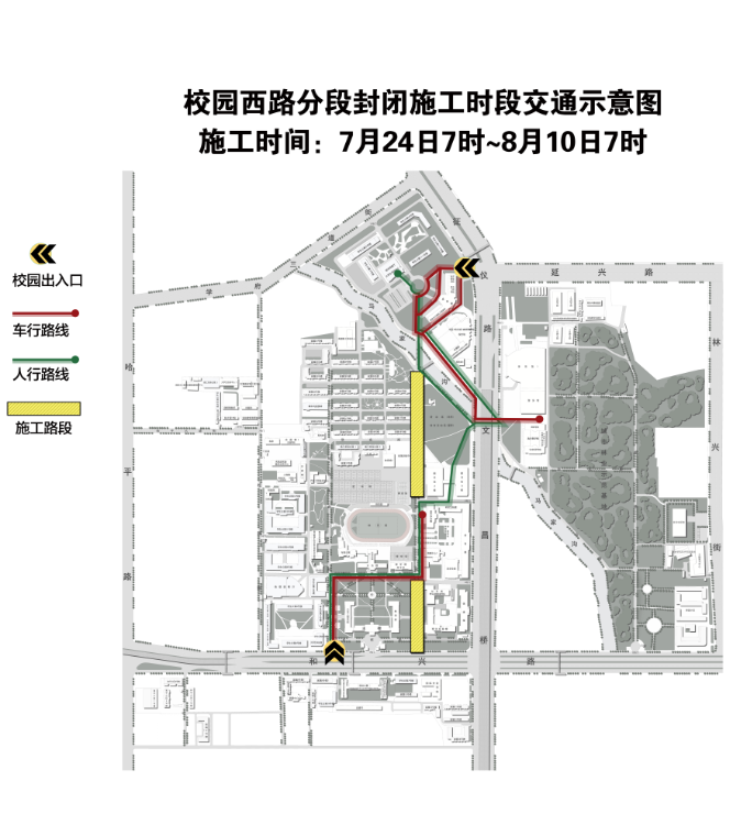 7月24日7时至8月25日7时,封闭校园西路(成栋路至夏馨路路段和图书馆A栋北侧至知行桥路段);8月10日7时至8月25日7时,封闭校园西路(夏馨路至图书馆A栋北侧路段)。