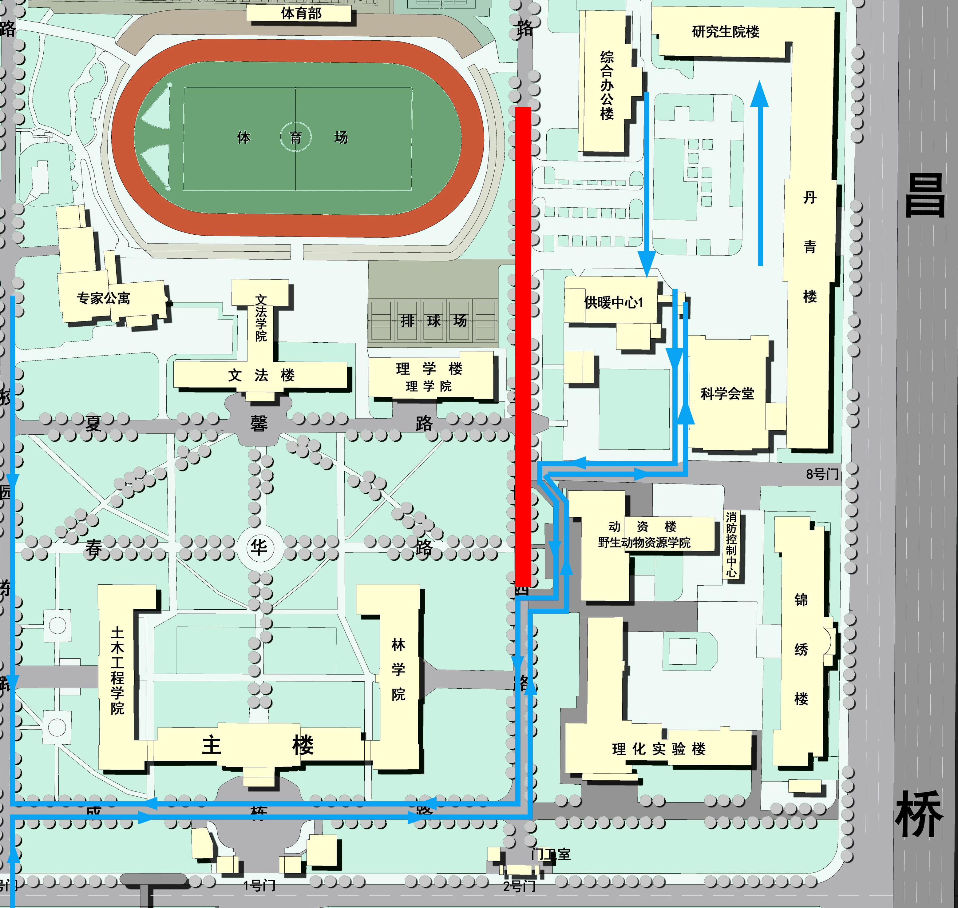 和兴路2号门、37号家属楼门岗至行政楼:校园东路→成栋路(主楼前)→校园西路→动资楼前道路→科学会堂后侧道路→行政楼周边。