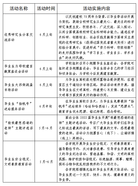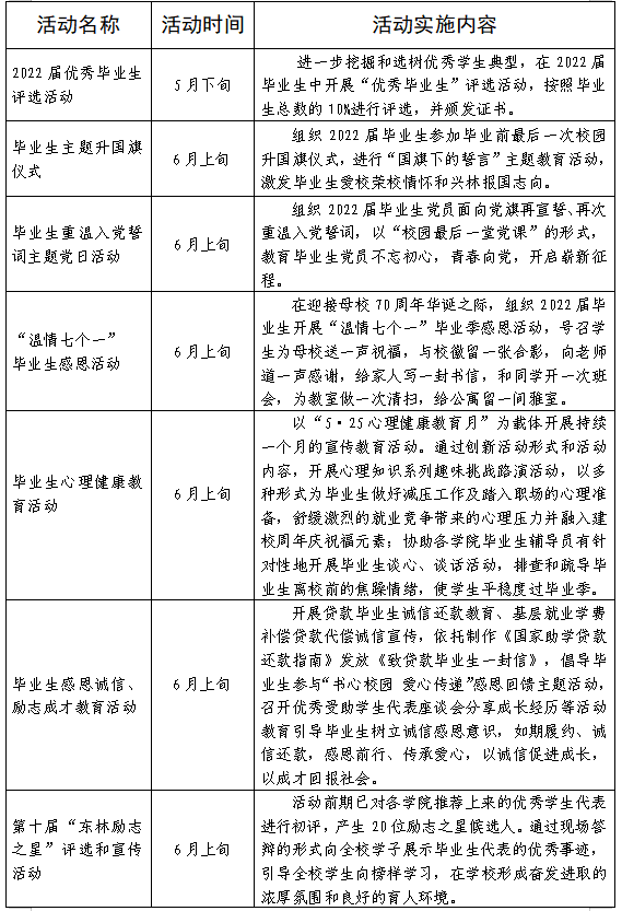 以打造温情毕业季为“课程主题”,线上线下相结合,设立以“理想信念教育、爱校荣校教育、文明素质教育、安全稳定教育、心理健康教育、生命智慧教育、感恩诚信教育、励志成才教育、遵纪守法教育、社会责任教育”等教育内容为核心的“课程体系”,不断丰富“课程形式”,为毕业生讲好大学生活“最后一课”,努力培养堪当民族复兴重任的时代青年。