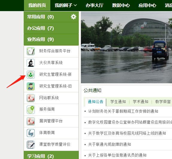 2.进入“业务应用”,选择“研究生管理系统-新”