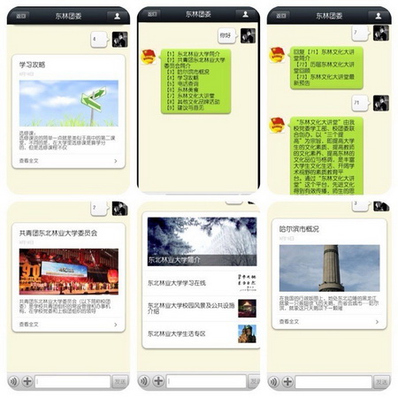 除以上固定板块外,微信平台还开设了东林简介、东林团委、哈市之最、校园生活、学习攻略、校园电话查询、东林文化大讲堂及其他校园品牌文化活动等自动回复功能。平台还将陆续开通“实时天气”等实时查询功能,为同学们的生活和学习提供便利。