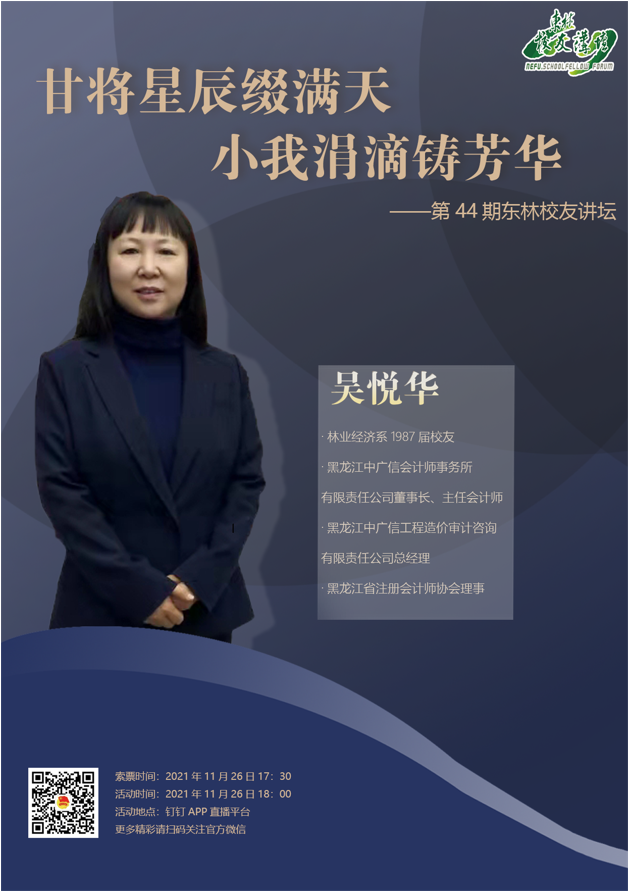 青衿之志,履践致远。吴悦华校友始终秉持着“白眼观天下,丹心报国家”的信念,将小我融入大我,利用自身专业所学,不断地躬行探索,并在1999年10月成立了黑龙江中广信会计师事务所有限责任公司。在执业20余年中,该公司多次承担省、市政府、国资委等部门大型审计项目,她作为项目总指挥,焚膏继晷,任劳任怨,把项目做到最好,在实现青春理想的同时,回馈社会,报效祖国,在融入民族伟大复兴梦的奋斗中绽放自己的青春光彩。