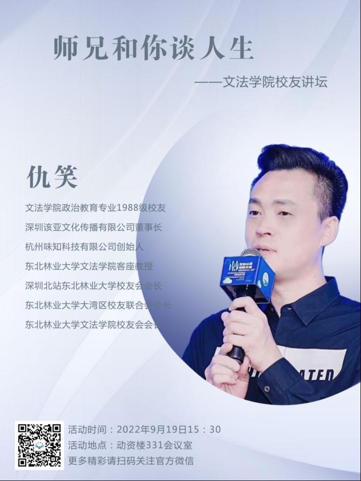 作为深圳知名策划人、导演,先后策划执行2017世界植物学大会、首届全球激光及智能制造高峰论坛、首届深圳中东欧经贸文化洽谈会、世界时尚小姐深港澳大赛、中国体育模特大赛等国际国家级活动;策划执行演唱会、音乐节、大型企业集团颁奖盛典、营销大会、地产公关等上千余场;并成功为多家上市企业提供文化建设、品牌设计、影视制作、年度宣传推广。客户群体涵盖政府部门、事业单位、高校、银行、地产、互联网、科技制造等,其中包括世界500强企业平安集团、腾讯、正威集团、华润集团、艾默生网络能源等。仇笑校友将结合自身工作经历,深情讲述他长期创业的所感所悟,分享他对大学生未来创业、就业的独特见解和深刻认识。