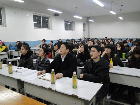 在精彩的报告之后,岳院长发表了热情洋溢的讲话,他对三位留俄同学所取得的成绩给予了充分地肯定,表扬了她们充分利用国外语言环境认真学习的精神,并且介绍了俄语专业与俄罗斯合作办学的各类留学和教学实习等项目,希望同学们努力学习,抓住机会,走出国门,到目的语国家强化外语学习,开阔视野,提高跨文化交际能力。