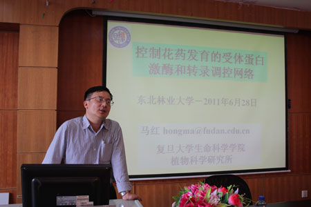 报告会由李玉花院长主持。第一场报告的题目为《控制花药发育的受体蛋白激酶和转录调控网络》,马红教授分别讲述了拟南芥花药结构,花药早期发育,ER、ERL1、ERL2调节雄性育性、花药分化受BAM1和BAM2受体蛋白激酶调控等问题。