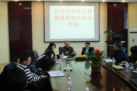下午2时,张文杨教授在外国语学院院长王丹教授的陪同下,在外国语学院会议室与MTI翻译硕士专业的任课教师和同学进行了座谈。座谈会由英语系主任赵莉教授主持。 张文杨教授从个人经历和学习策略两个角度出发阐释了自己对英语学习的理解。随后,张文扬教授对同学们所提出的问题进行了一一解答。座谈会现场气氛活跃,大家踊跃发言。座谈之后,外国语学院院长王丹教授与张文杨教授就今后的合作意向进行了会谈。王丹院长对张教授莅临外国语学院讲学再次表示诚挚的感谢,并希望张文杨教授能够经常来beat365访问和讲学,为外国语学院的学科建设和科研水平的提高出谋划策。