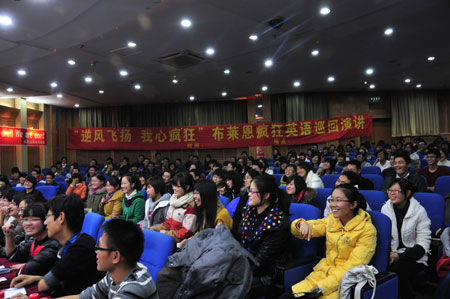 著名发音口语教育专家、疯狂英语全国十大王牌讲师之一刘思峰老师莅临了本次活动现场。讲座以“巧学英语,点燃激情”为主题,刘老师强调要以“求知若饥,虚心若愚”为学习精神,他充满激情与幽默感的演讲,把整场活动的气氛一次次带向高潮。