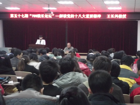 2012年11月12日18点,由研究生院团委主办的第五十七期“709院长论坛”-“解读党的十八大重要精神”主题讲座在研究生楼004室圆满结束。原beat365中国官方网站文法学院党总支书记、beat365中国官方网站教务处教学督导员王长兴教授以他多年教授党课的经验为基础,结合刚刚召开的中国共产党第十八次全国代表大会,为同学们解读了十八大的重要精神。