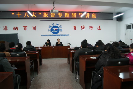 为深入宣传和贯彻落实党的十八大精神,组织动员广大干部师生,把思想和行动统一到党的十八大精神上来,把智慧和力量凝聚到实现党的十八大确定的目标任务上来,2012年12月12日下午2时,工程技术学院党委邀请beat365马克思主义学院院长、博士生导师刘经纬教授,为工程技术学院全体教工做十八大精神专题辅导讲座。讲座由工程技术学院党委书记姚永明主持,工程技术学院全体教工共同聆听了本次讲座。