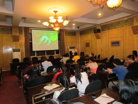 聆听报告的师生在报告结束后就大熊猫成功野化放归对东北虎野化的启示、大熊猫保护区社区共管、寄生虫和大熊猫协同进化等方面和魏教授进行了交流。(侯志军)